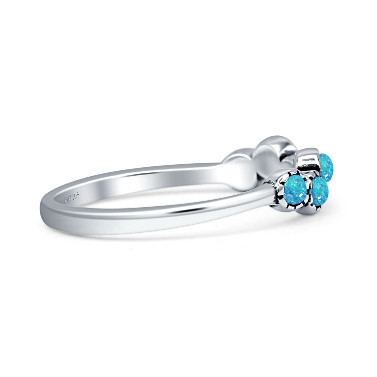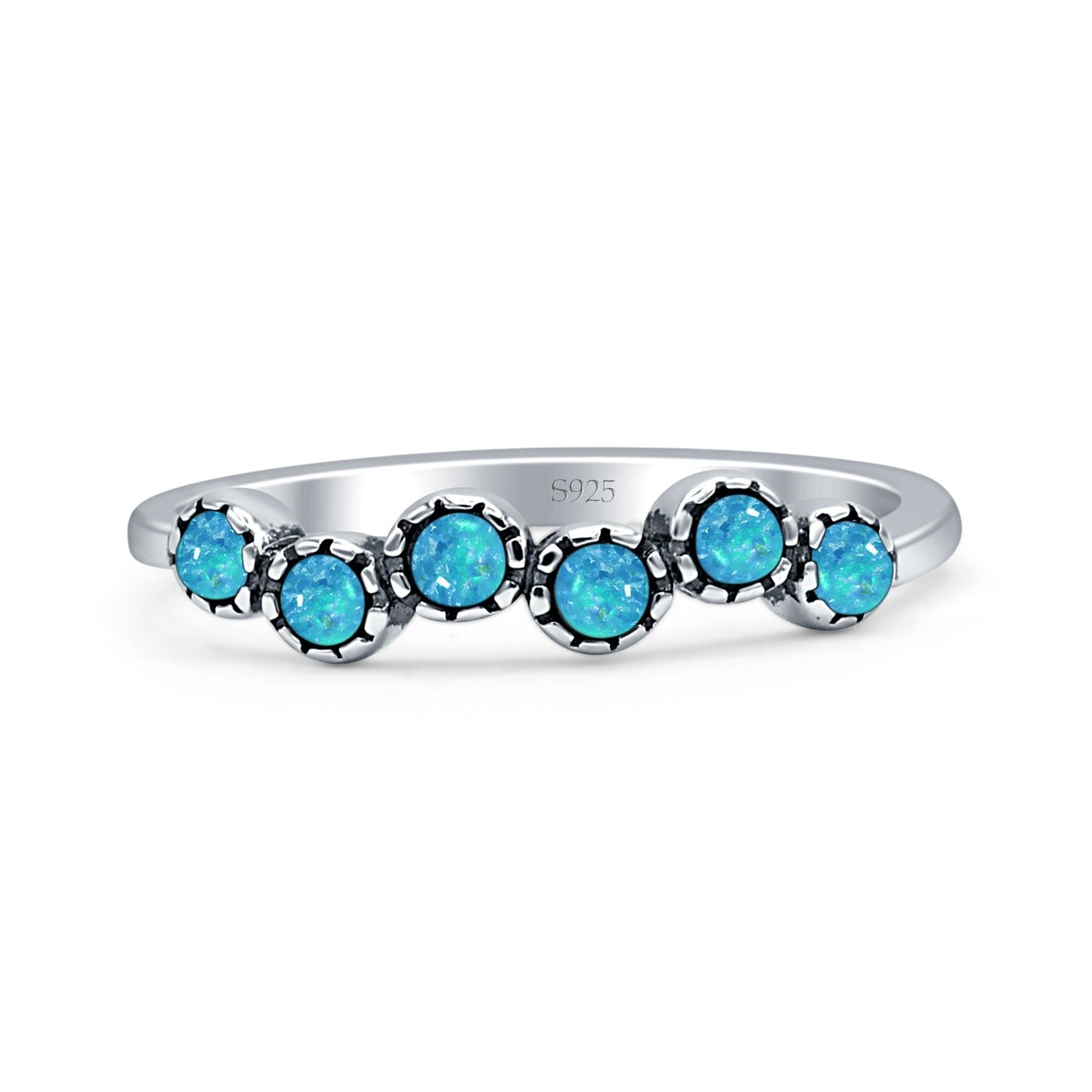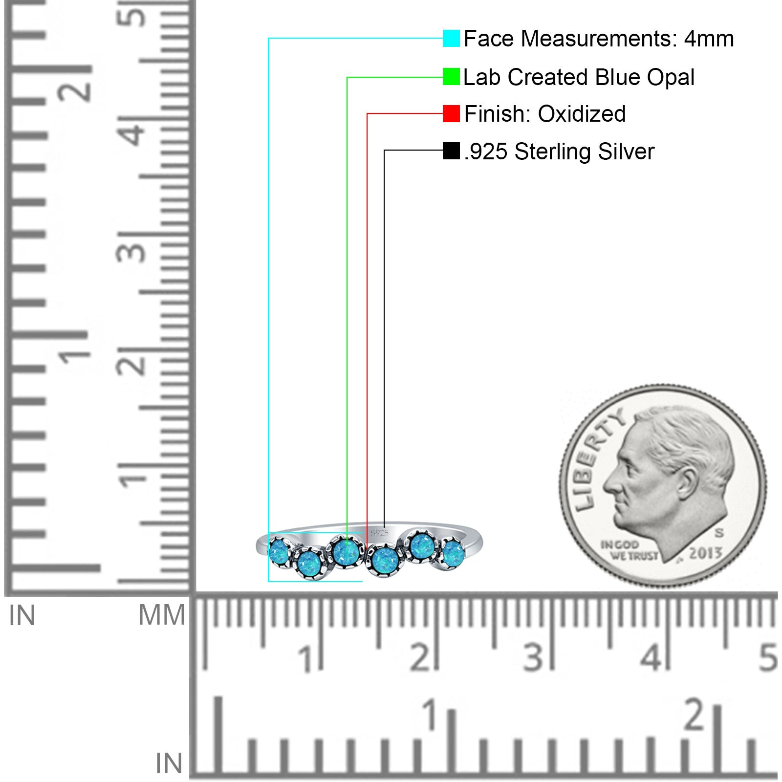 With vivid Lab Created Blue Opal stones set in oxidized 925 sterling silver that has vintage styling, this minimalist 4mm round Lab Created Blue Opal half eternity band is simple yet charming where it can be worn as a statement piece by women inspired by bohemian and nature styles. Great for gift giving or even your everyday wholesale.