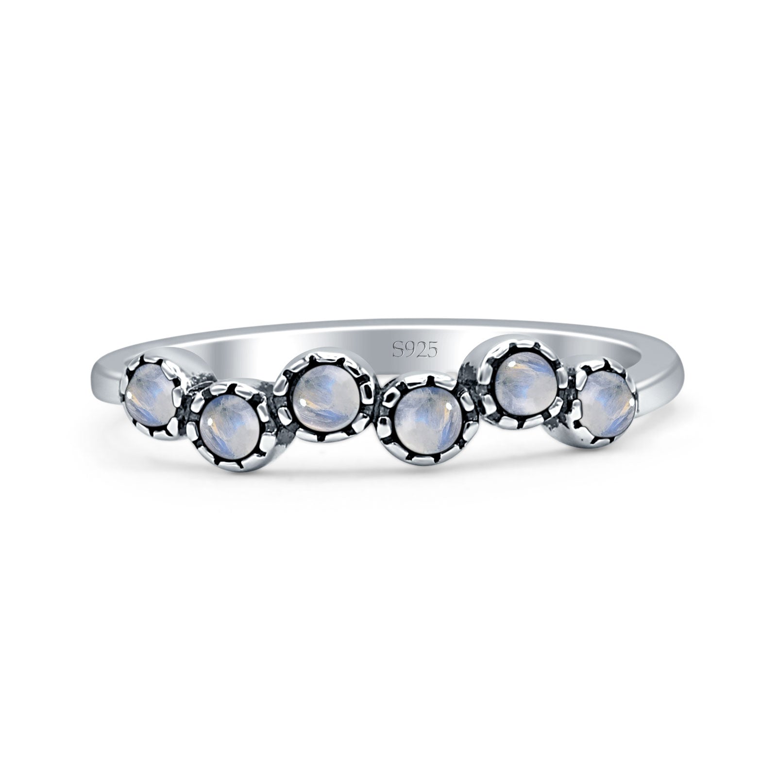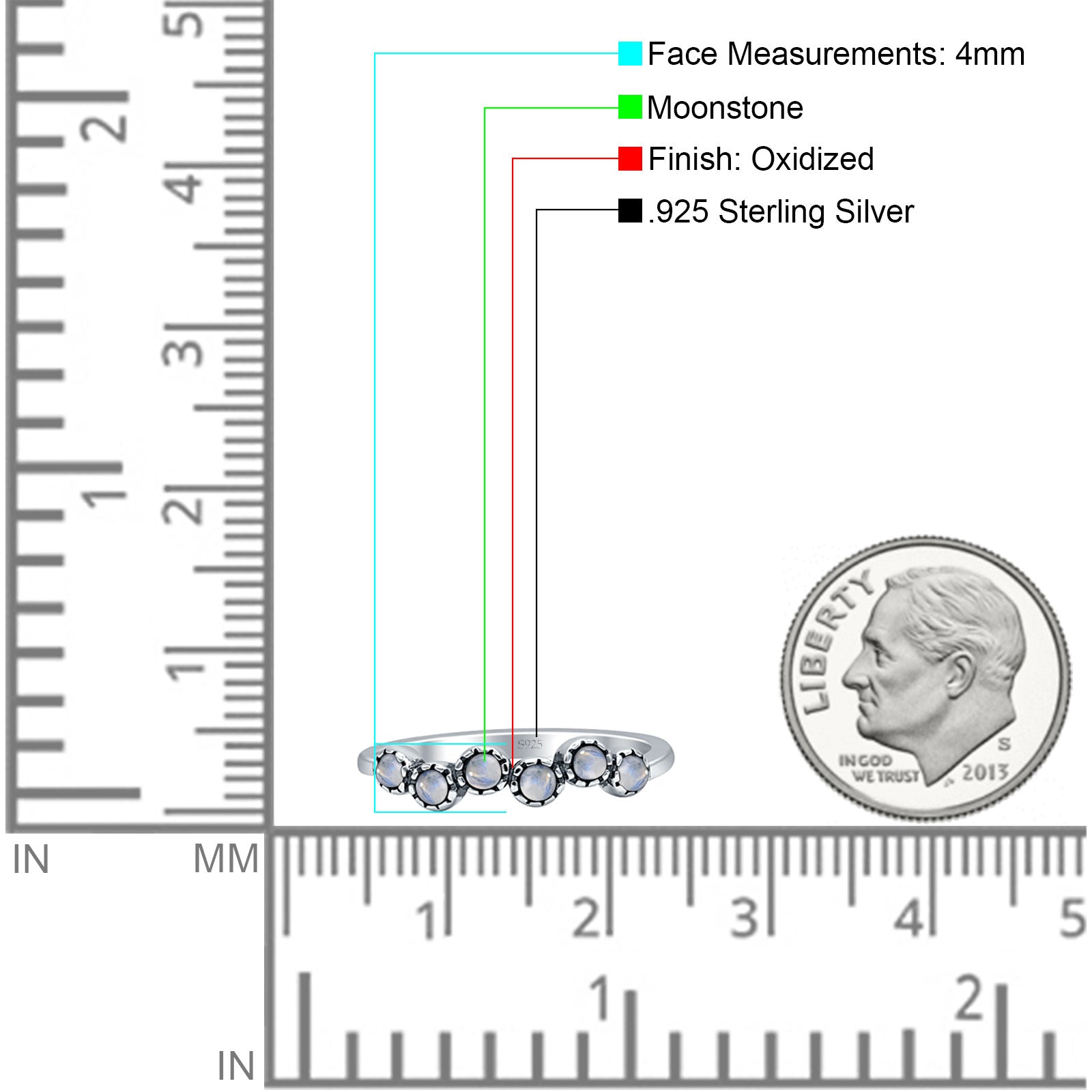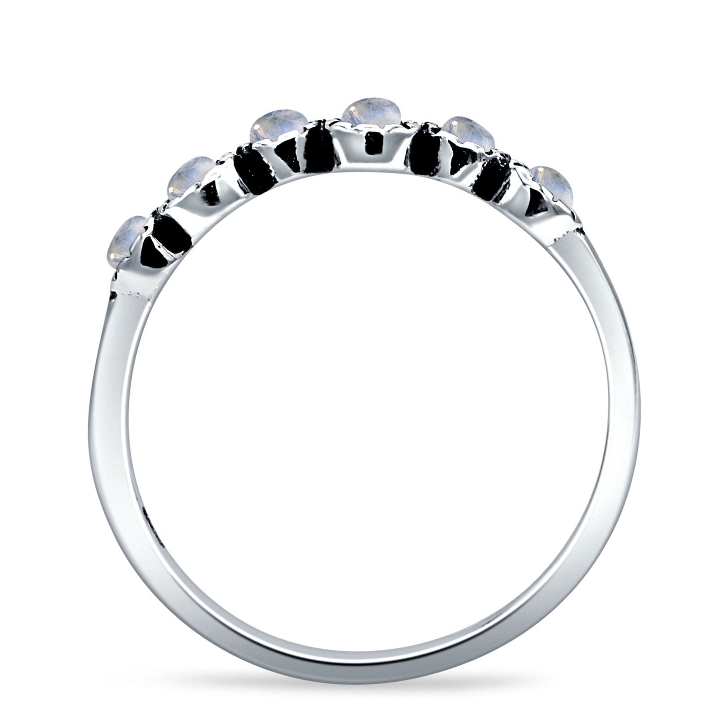 With vivid Moonstone stones set in oxidized 925 sterling silver that has vintage styling, this minimalist 4mm round Moonstone half eternity band is simple yet charming where it can be worn as a statement piece by women inspired by bohemian and nature styles. Great for gift giving or even your everyday wholesale.