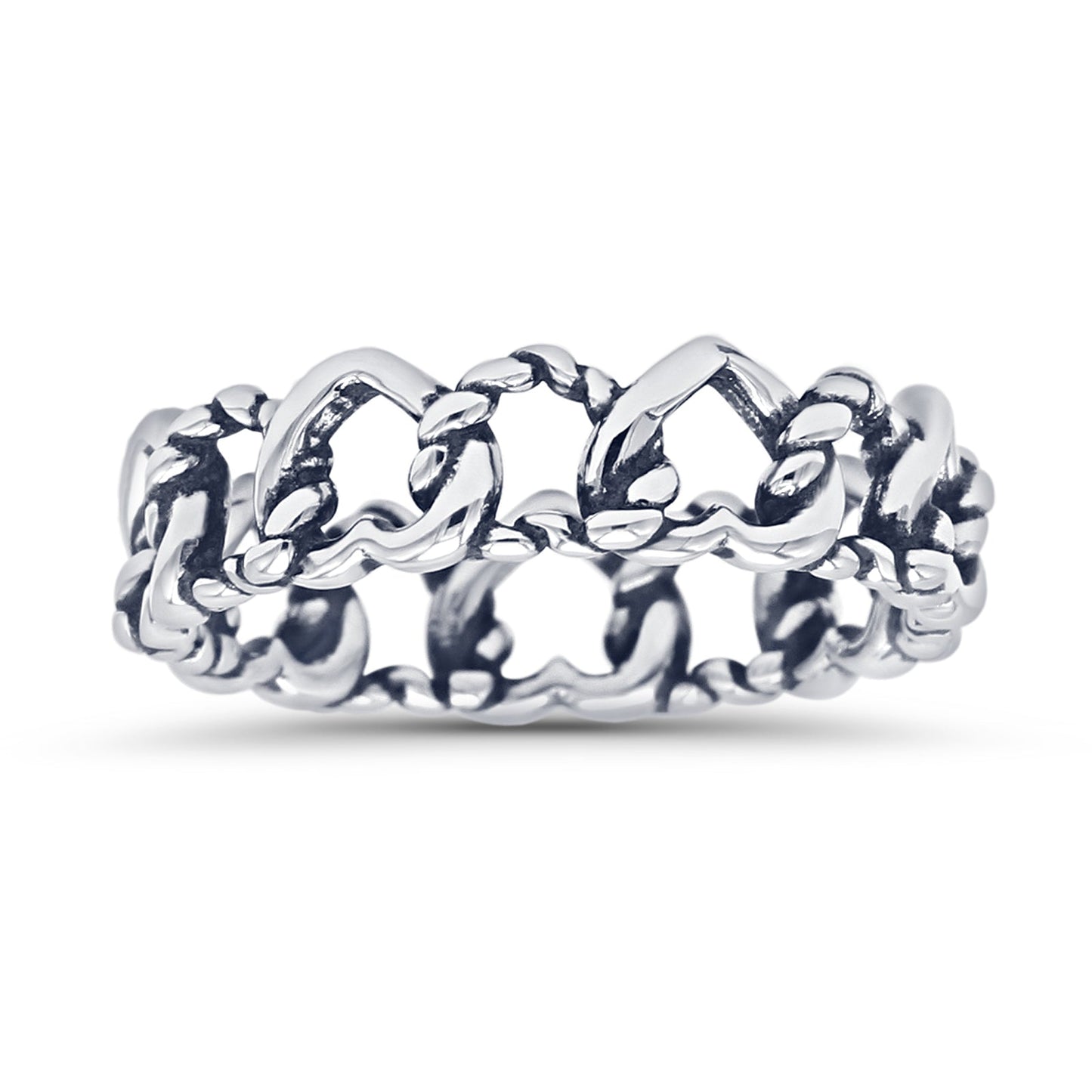 Minimalist 5.4mm interlocking heart band with oxidized vintage finish and rope design. Crafted from genuine 925 sterling silver, perfect as a thumb ring or stacking piece for affordable silver jewelry collections.