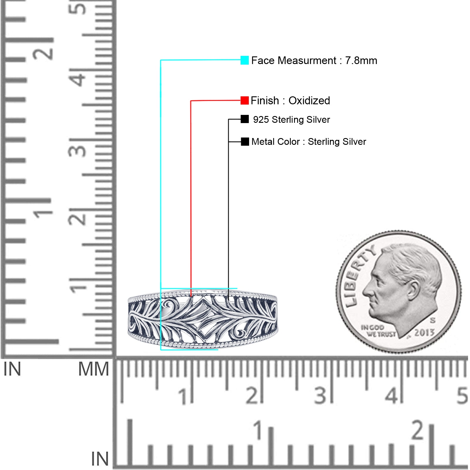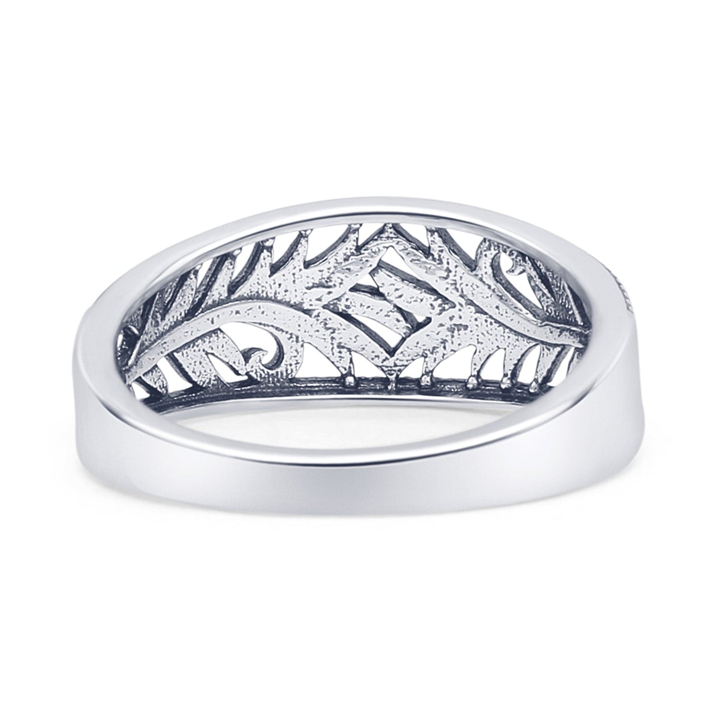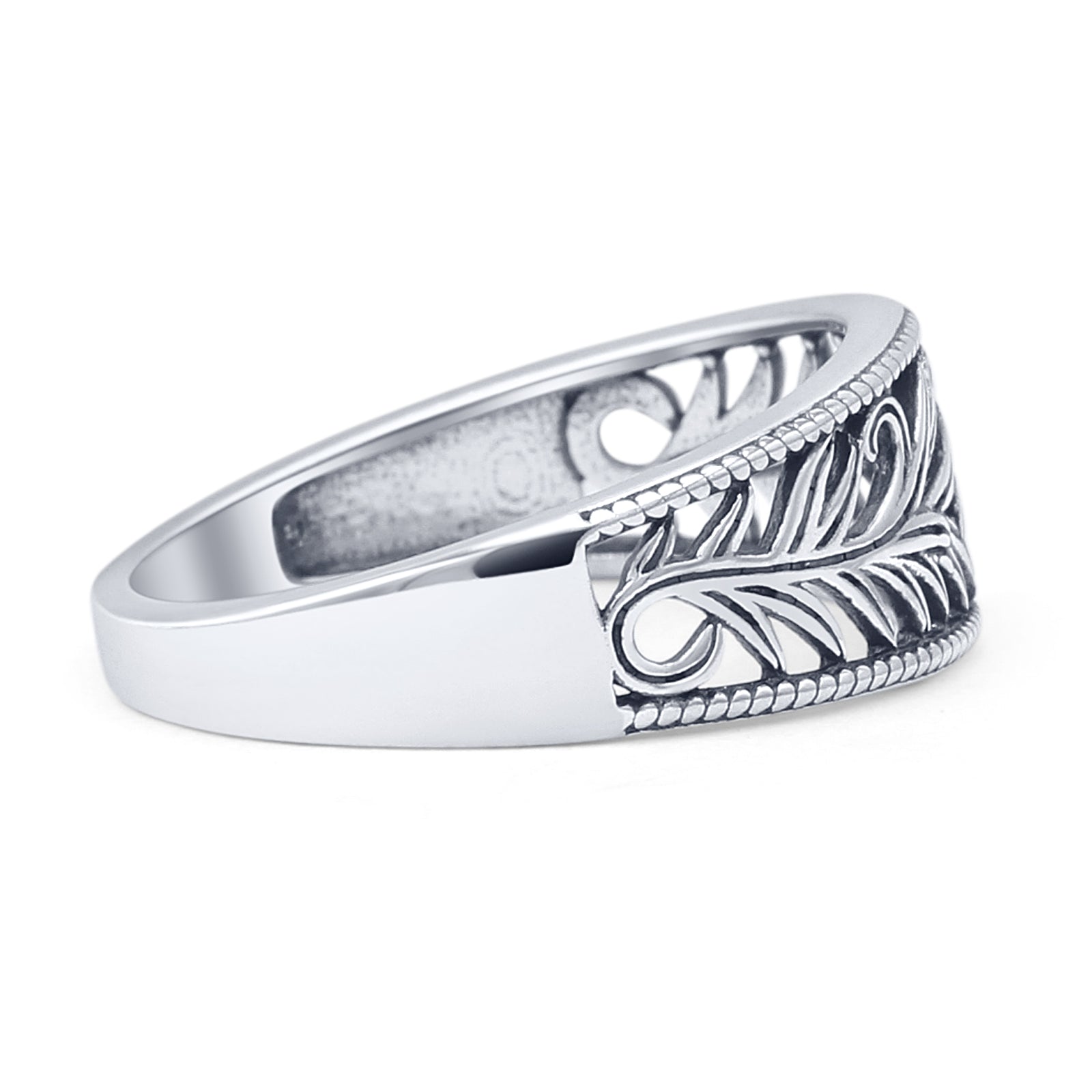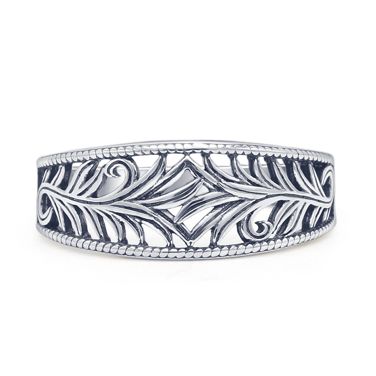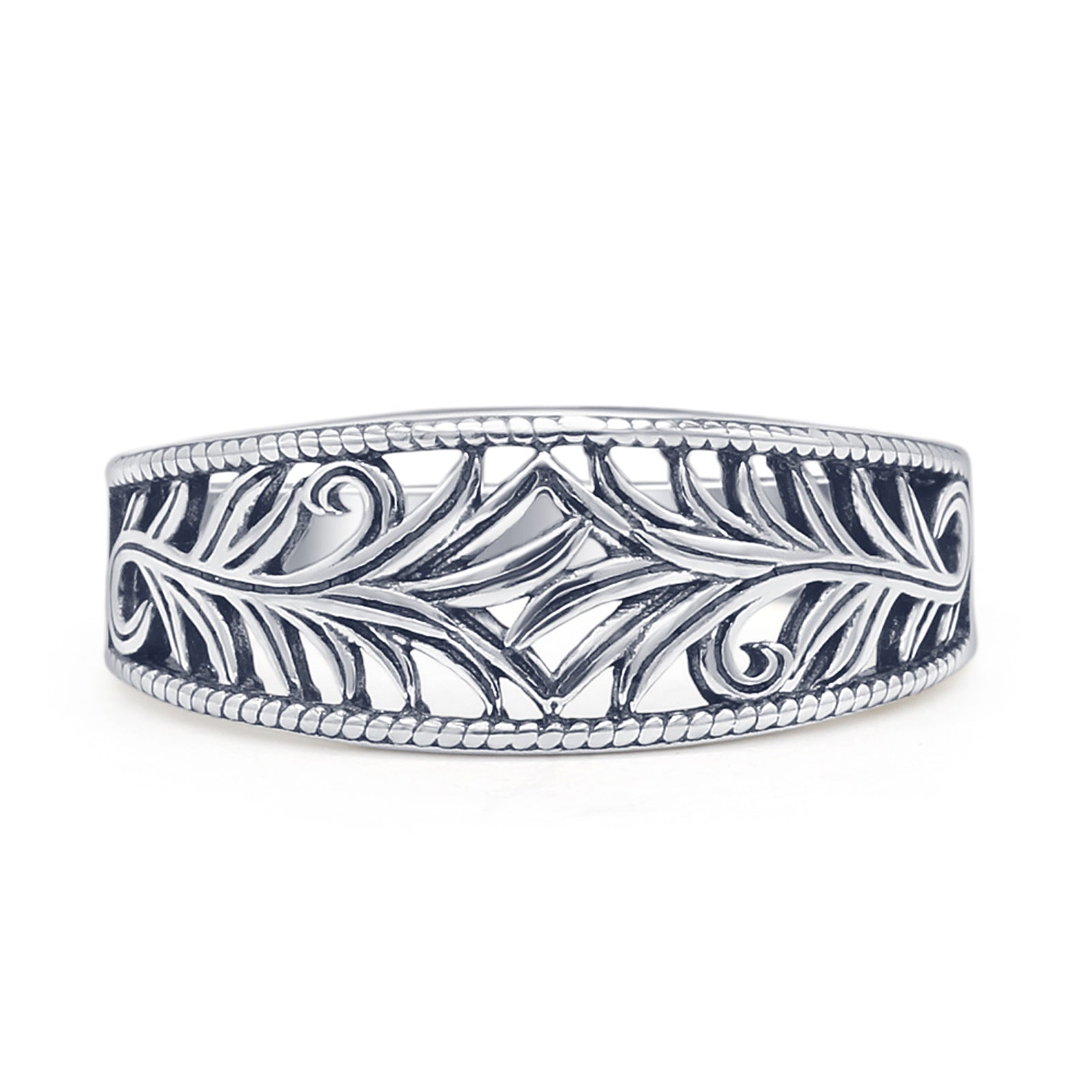 The minimalist 7.8mm leaf vines band ring has vines of leaves all over the band with detailed leaf vines, beaded edges, and oxidized filigree, all in solid 925 sterling silver. It would be great as a thumb ring or statement ring. This is a vintage-style ring is very unique. Great for boho and nature-themed wholesale collections!