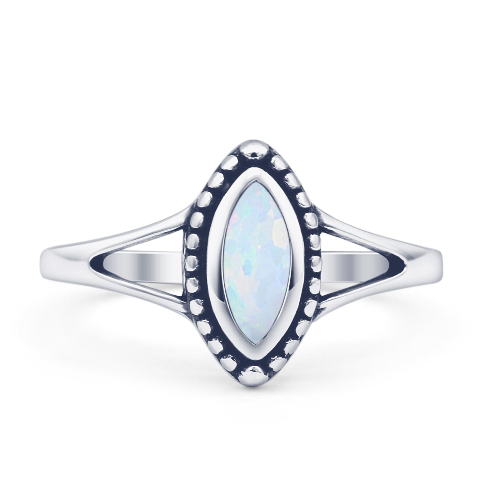 Marquise Lab Created White Opal Beaded Oxidized Ring