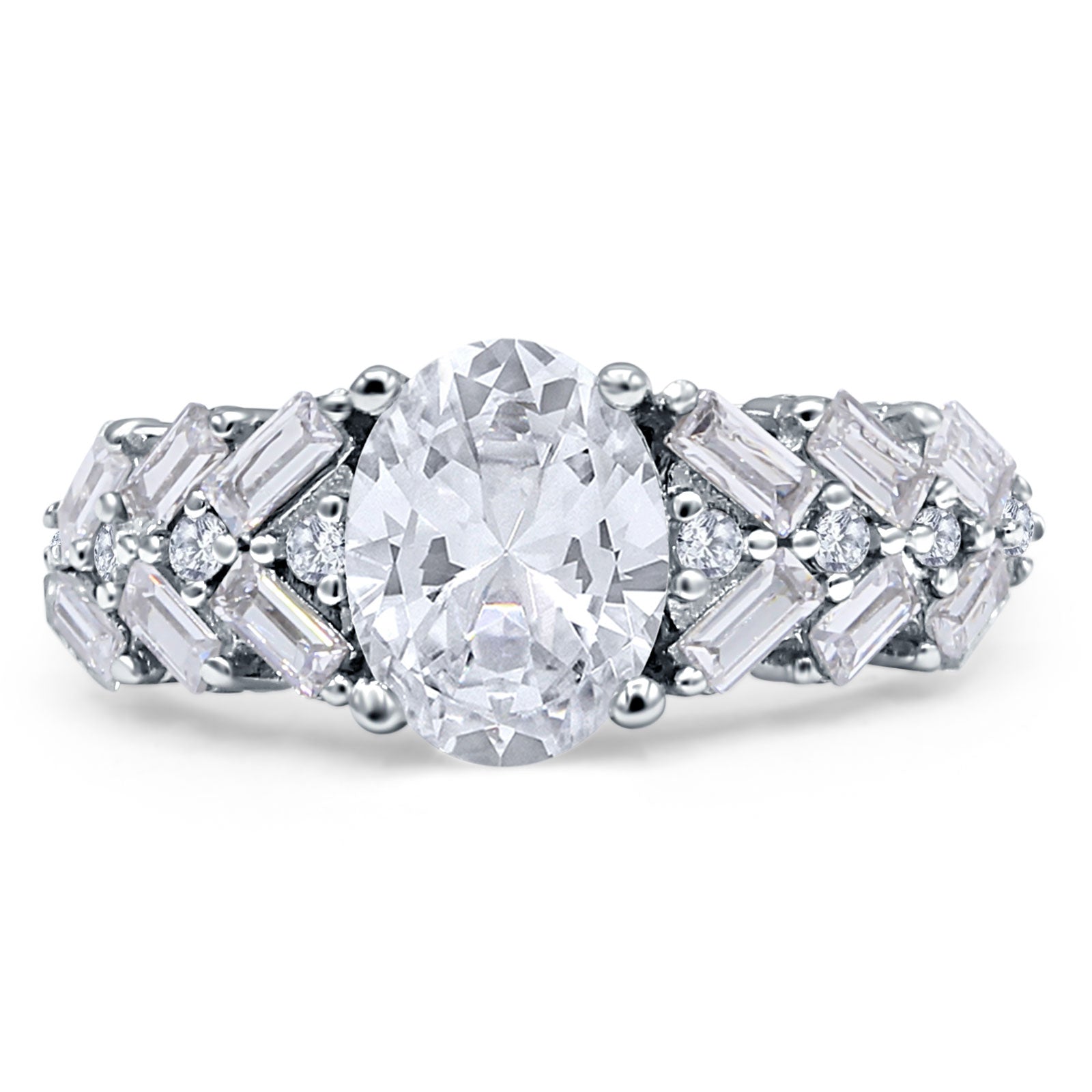Make a statement with this art deco 8mm oval ring, which features a vintage-style cluster of both baguette and round cubic zirconia stones set in 925 sterling silver. The lovely oval center stone is surrounded by a fan of sparkling, radiant accents befitting the glamour of the roaring twenties! This ring collection is excellent for weddings, engagements, and special occasions. Best bling gift for her!
