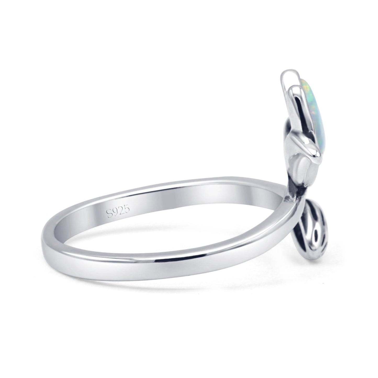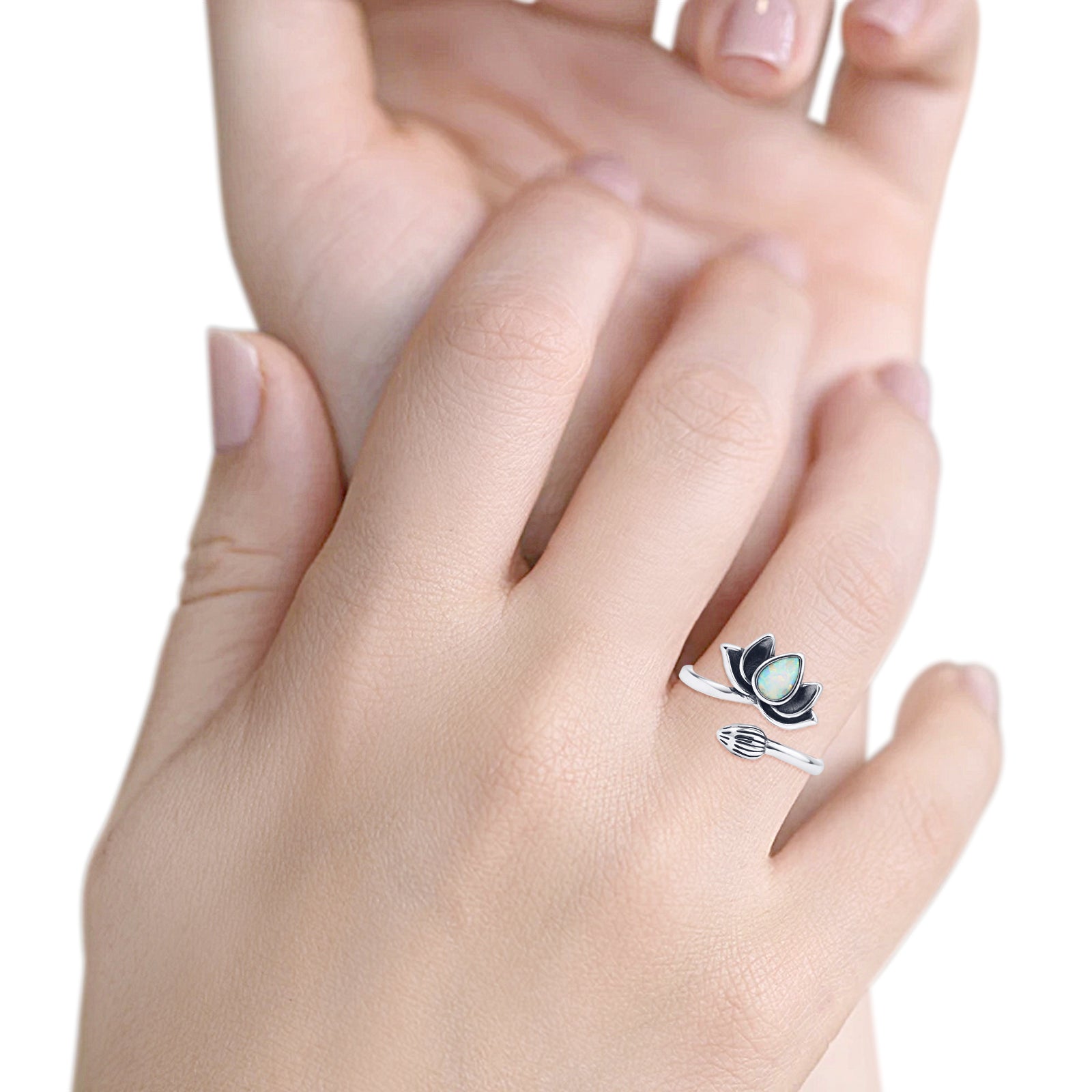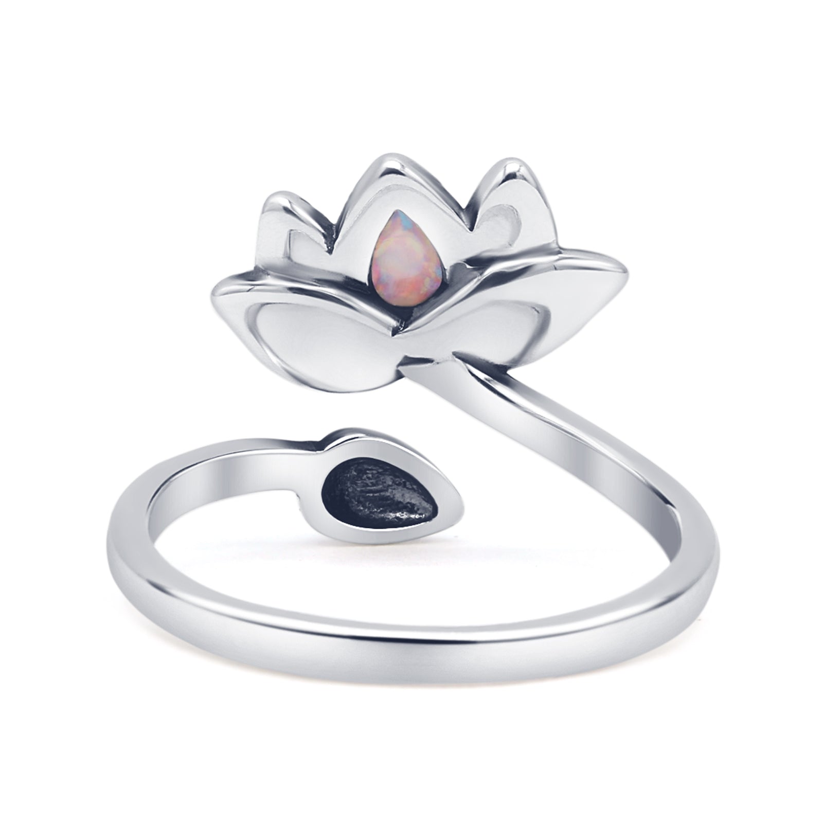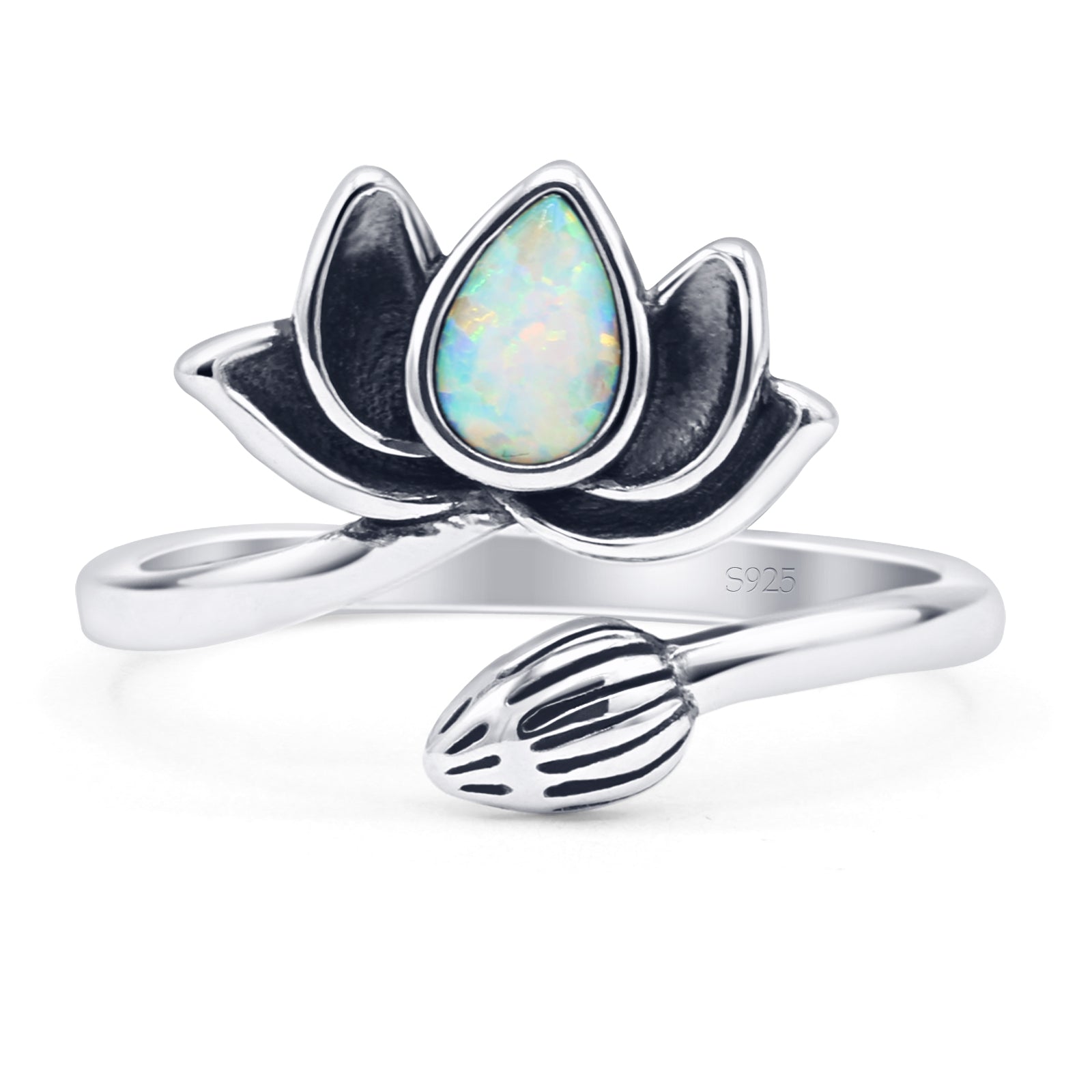 Pear Lab Created White Opal Lotus Bud Oxidized Ring