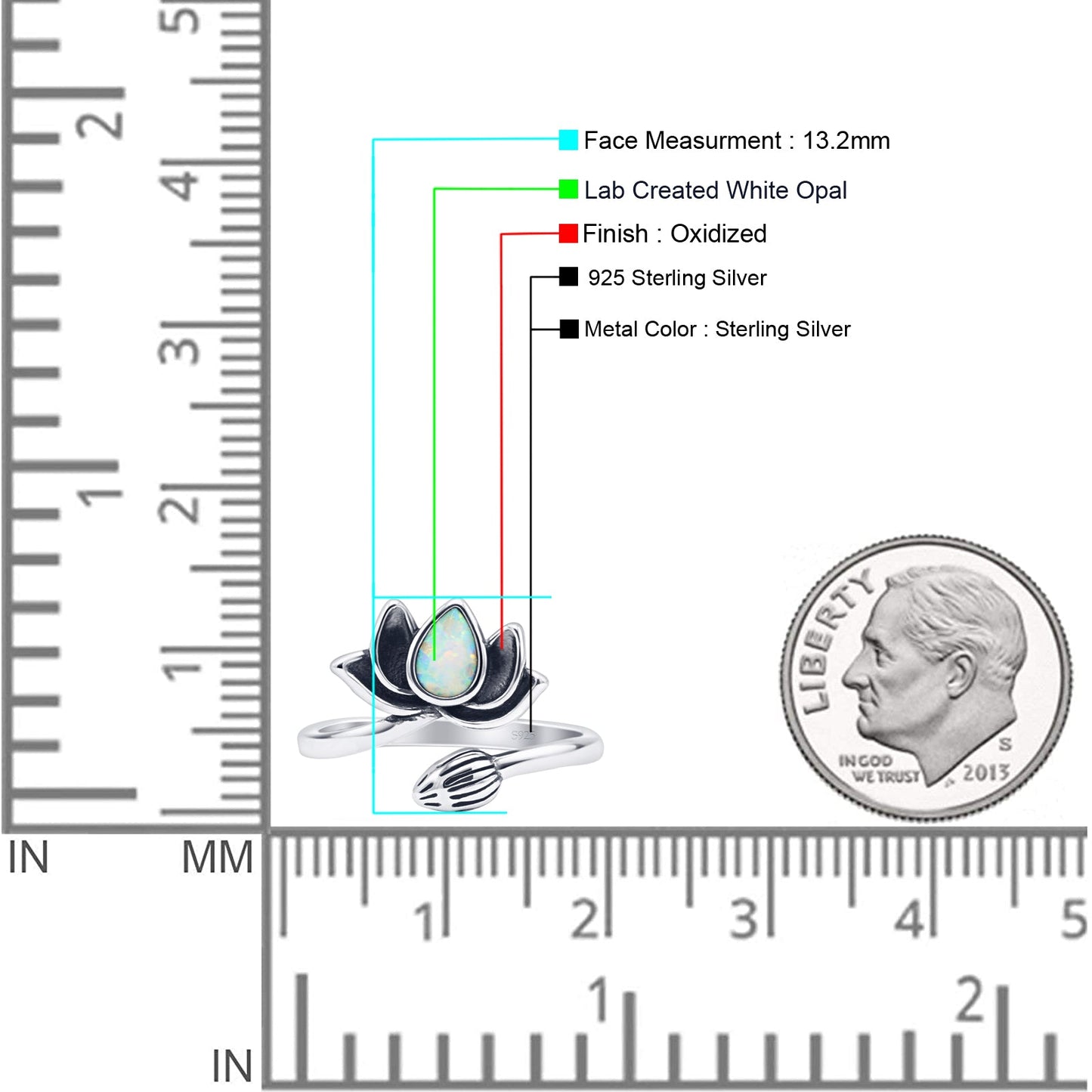☉Ring Design: Pear Lab Created White Opal Oxidized Lotus Adjustable Ring.