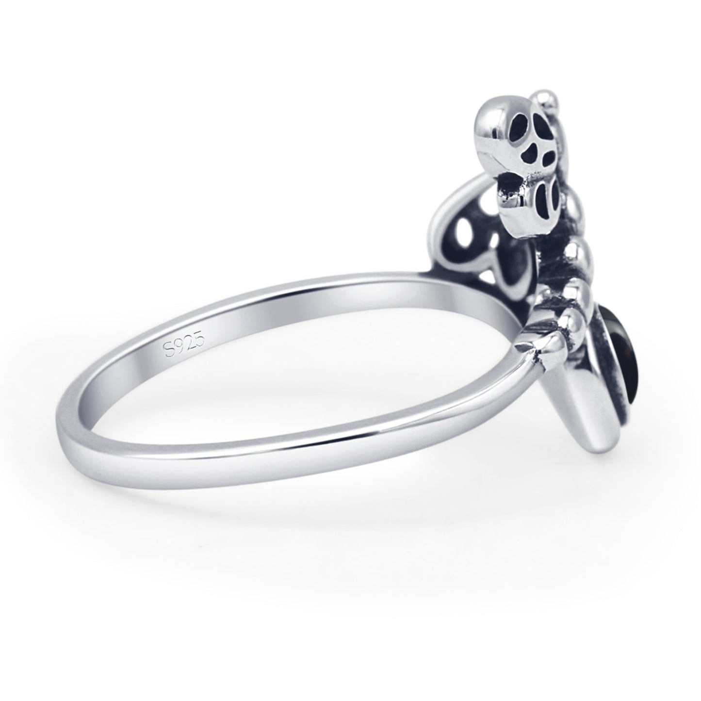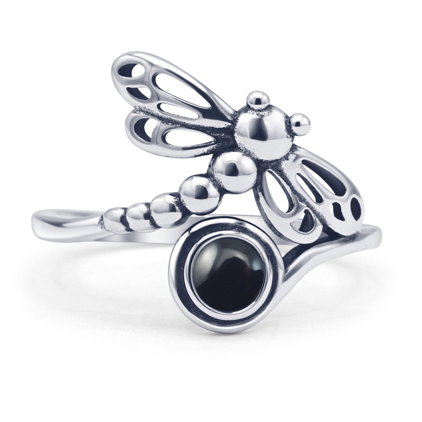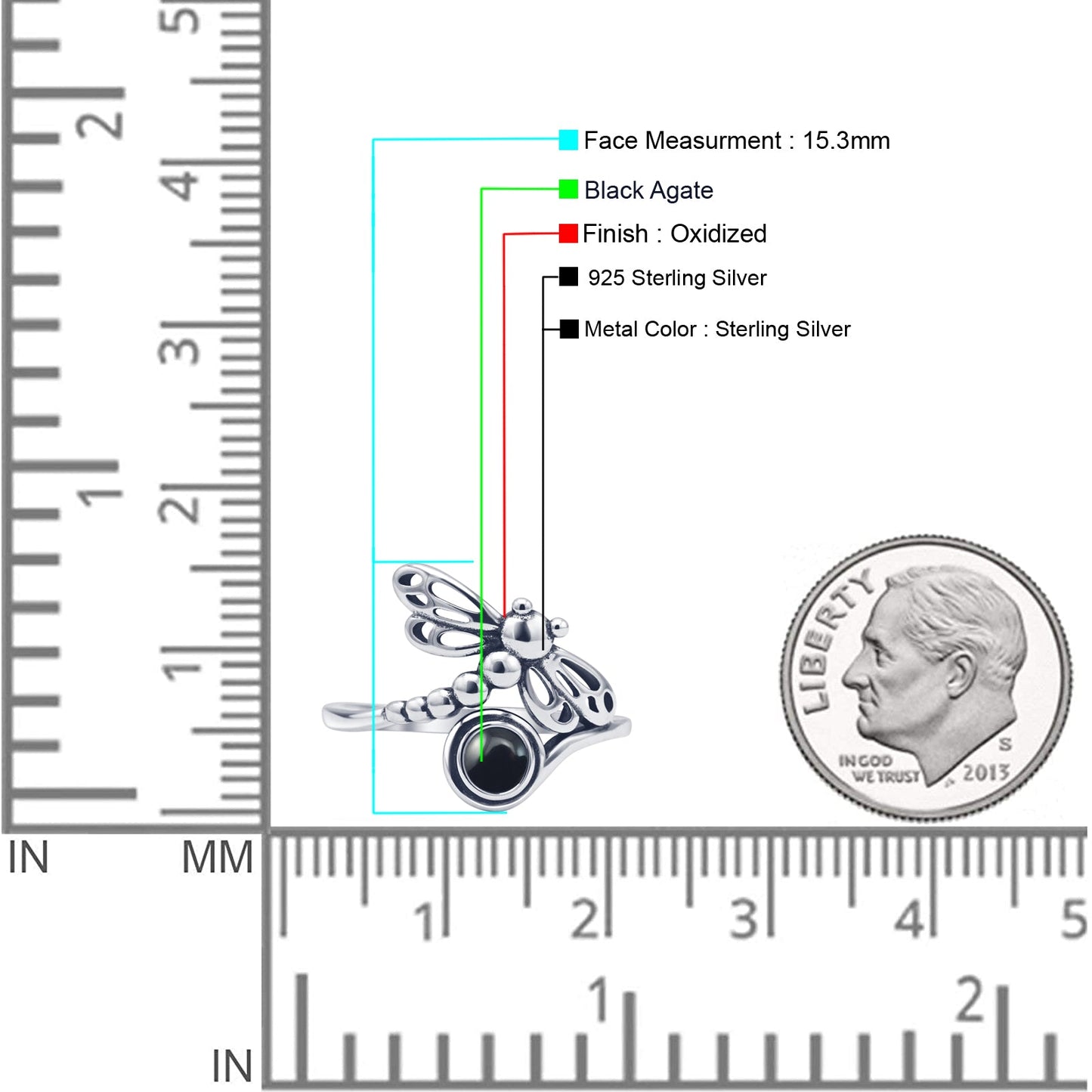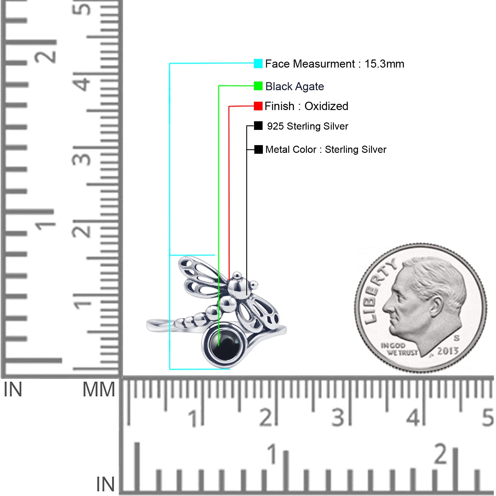 ☉Ring Design: Round Black Agate Oxidized Filigree Dragonfly Ring.