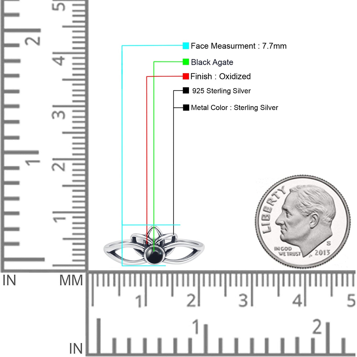 This ring merges the two concepts of symbolism and style wonderfully. It is a 925 sterling silver ring with detailed oxidized filigree, it features a 7.7mm round black agate lotus and it has a little bit of glow to it. The lotus and glowing opal combine to create a statement piece that is spiritually and nature inspired. This ring can be worn every day and makes a wonderful gift!