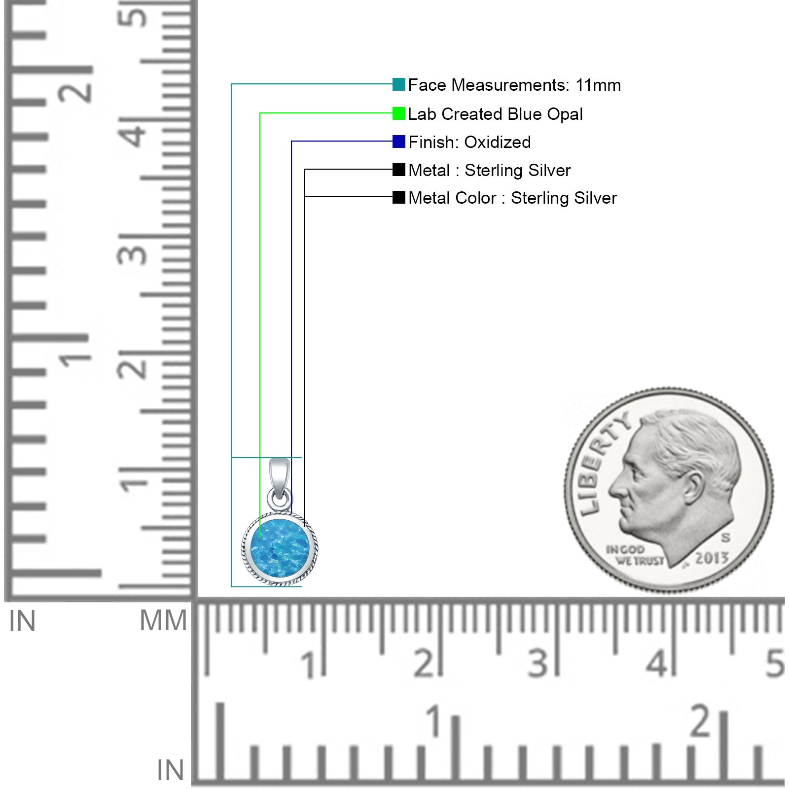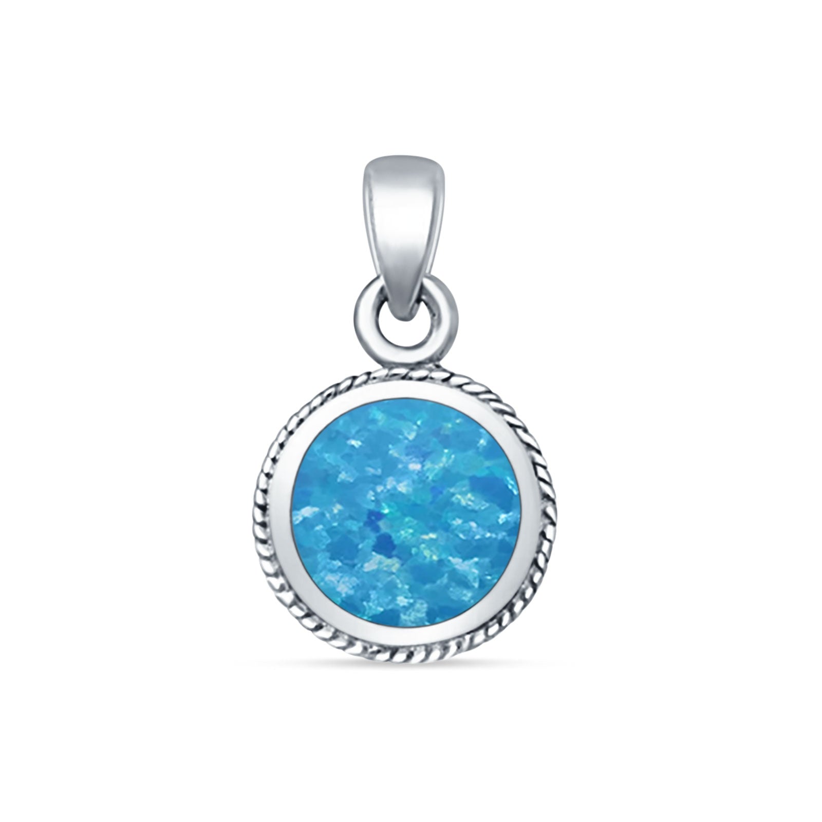 This 11mm round lab-created blue opal pendant in a twisted rope bezel, in oxidized 925 sterling silver gives this piece a vintage-like design. The oceanic shimmer adds to charm. It's lightweight, can be slotted into gift bags and is great for ordering in bulk.