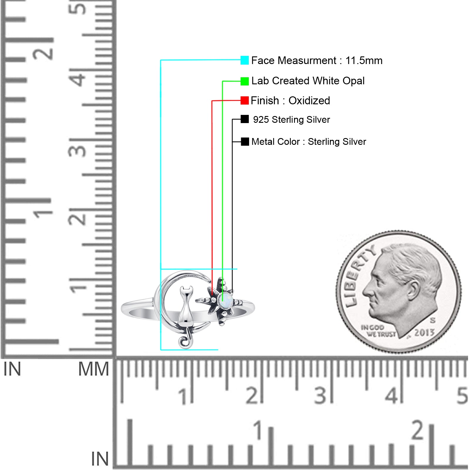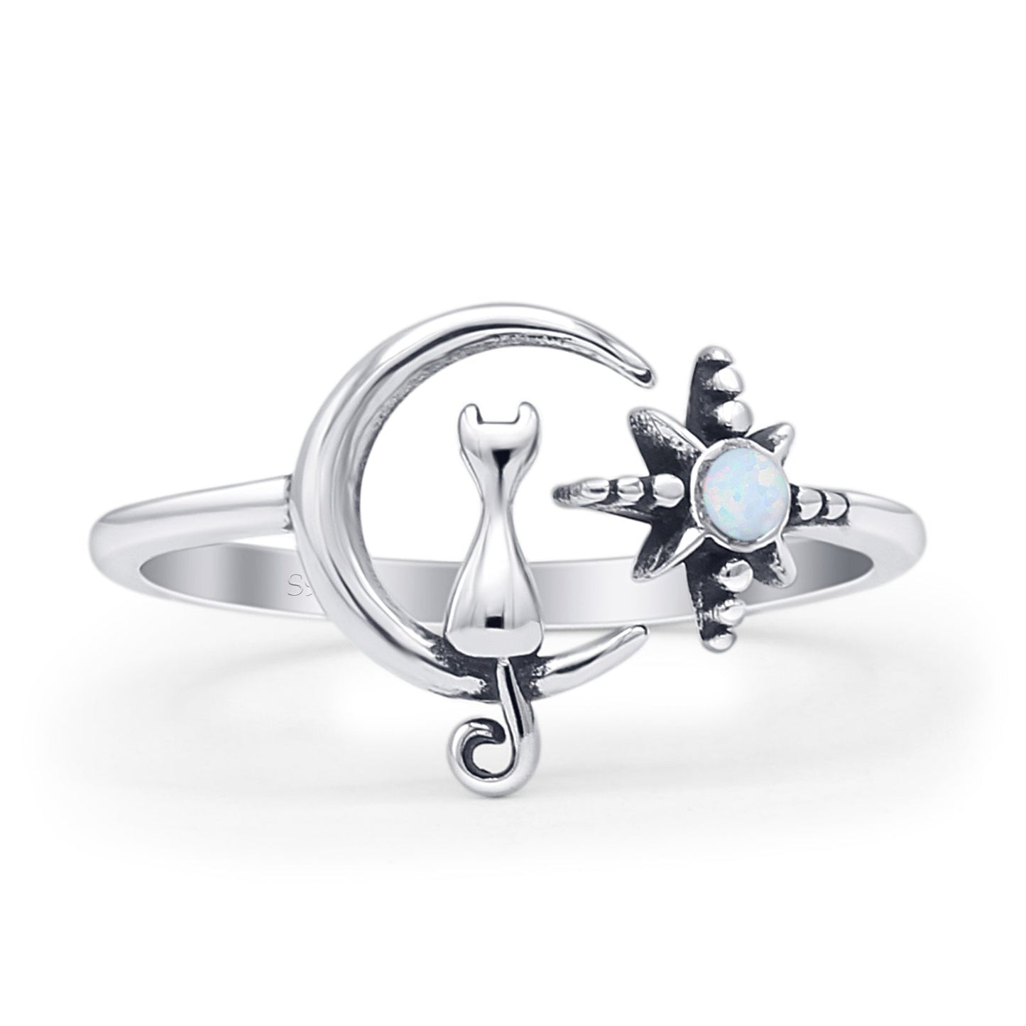 Round Lab Created White Opal Cat On Moon & Star Ring Oxidized