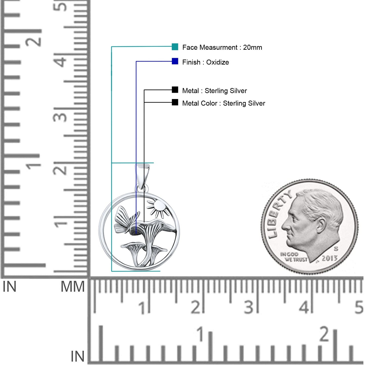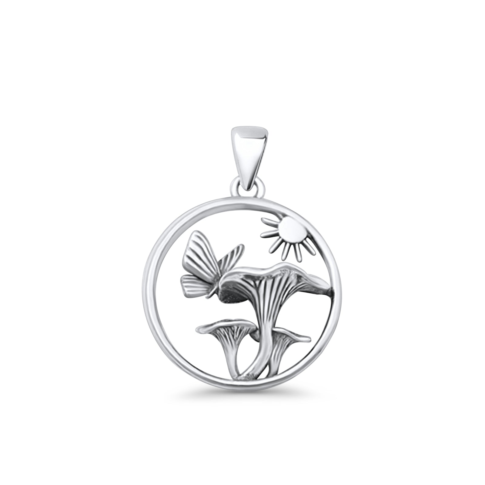 Sun butterfly mushroom pendant necklace made of oxidized 925 sterling silver with detailed filigree and chain. This vintage-style 20mm pendant combines nature-inspired elements to create a bold statement piece. Great for boho collections and customers who appreciate nature.